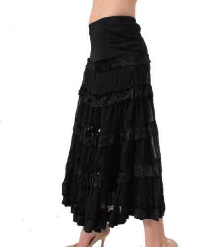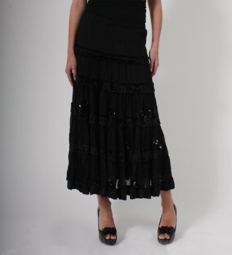 This silky chiffon maxi skirt in black by Romeo & Juliet Couture is decorated with bunches of sequins at the front. Scattered between each tier, the discs of sequins sparkle amid the velvet trim. Wear this skirt with a cropped top and a cropped fitted blazer. ...